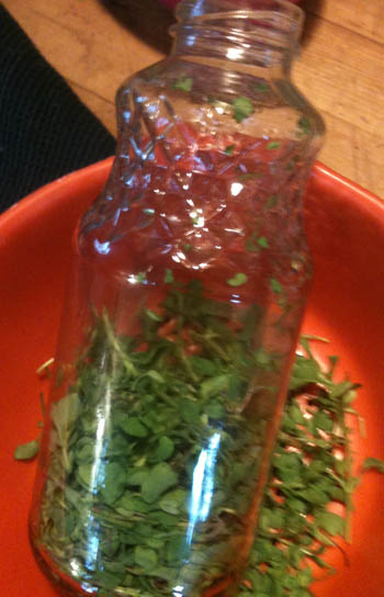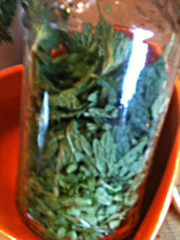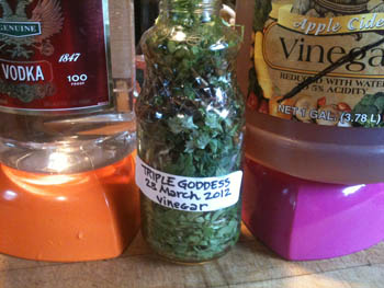 Gather your plants [photo 4] and cut into manageable pieces. Fill a jar 1/3 full of the maiden, [photo 5], then 1/3 full of the mother [photo 6], then the final 1/3 with the crone. Add vinegar or 100 proof vodka. [photo 7] Seal, label, and wait six weeks until use. The dose is a tablespoonful of vinegar in water or on food; or a dropperful of tincture takentwo or three times a day.