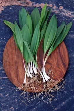 Slow growing ramps grow in clusters strongly rooted just beneath the organic layer of soil over a limestone outcropping on a north-facing slope that is timbered in hard woods on a well-shaded floodplain or above a streambed. They must be carefully dug in order not to tear the leaves or break their delicate bulb. Unmistakable with their garlicky odor and onion like flavor, ramps are only available for a few weeks in the spring. Mature ramps have two or three broad, smooth, shiny green leaves arising from a purplish lower stem that connects underground to a scallion-like, white, elongated bulb. Ramps can be commercially cultivated, but propagation from seed is difficult. It is possible to transplant them into loose, well-drained soil with lots of organic matter, and plenty of shade and moisture. Other plants you may observe scattered among the ramps are the Trout Lily, Bloodroot and Trillium.