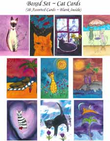 10 assorted cat cards with envelopes come packaged in a metallic gold decorative box with clear lid and gold tie. Cards are all blank inside. Each card is 5” x 7” (12.7 x 17.9 cm) and comes with an A-7 envelope. Each card is an offset reproduction of an original silk painting.
